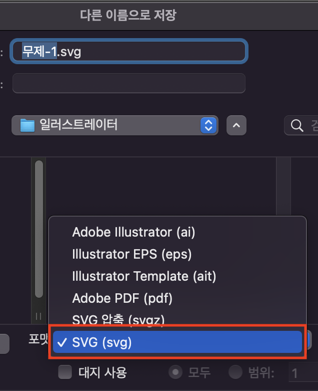 다른이름으로 저장, 파일 형식에서 SVG를 선택해주면 끝 입니다.