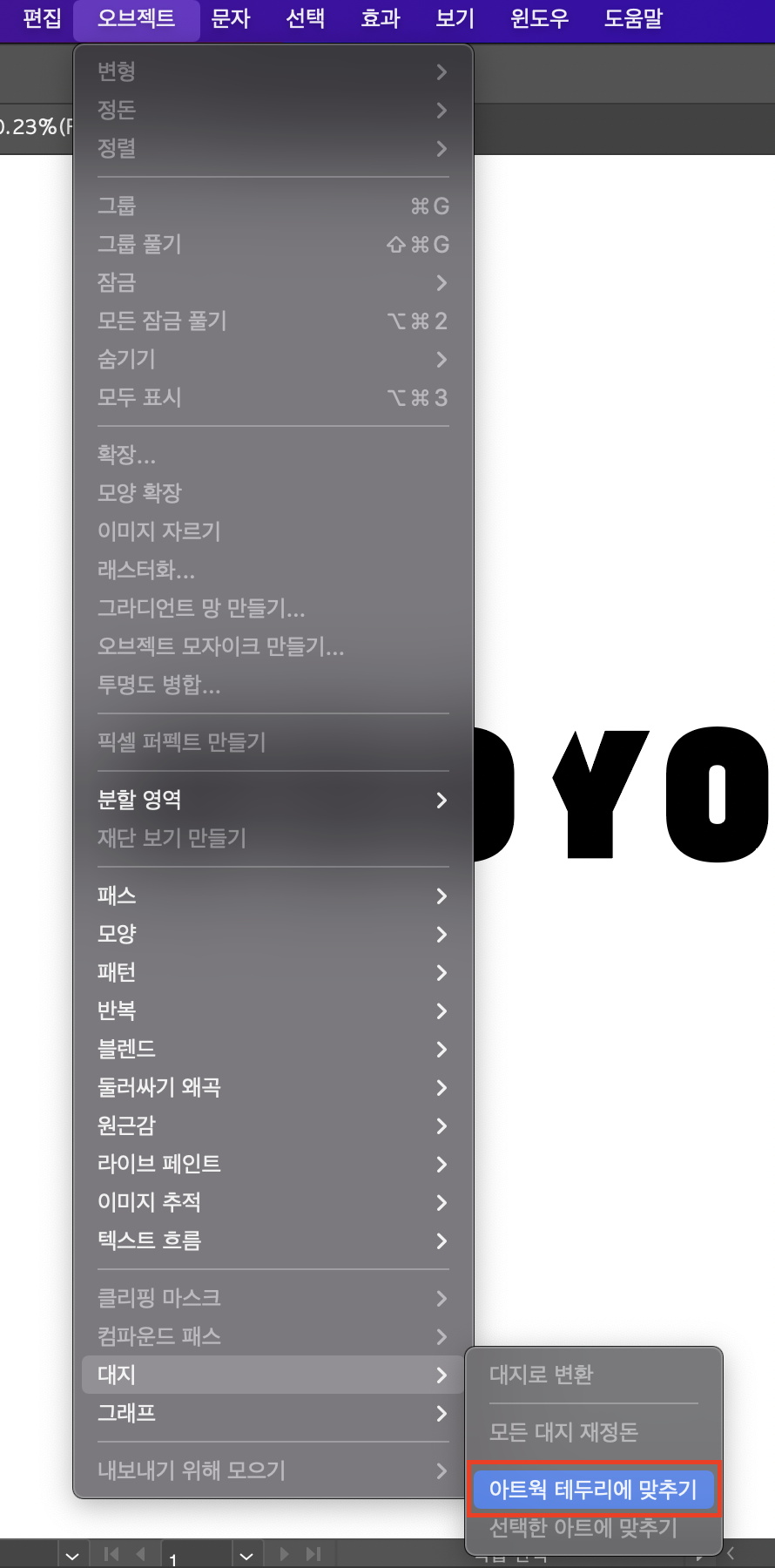 오브젝트 > 대지 > 아트웍 테두리에 맞추기를 눌러줍니다.