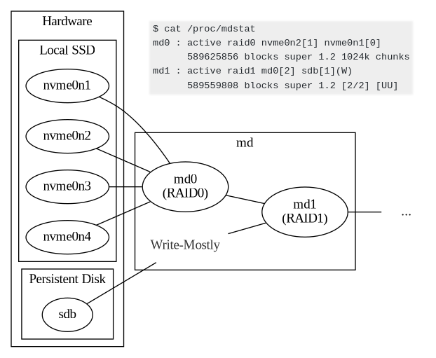 md의(다른데는 없음) RAID1이 "write-mostly" 설정을 지원하기 때문이다.